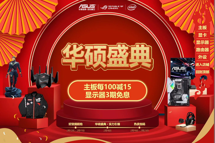 即日起至2月23号,华硕盛典新春大促活动于京东商城劲爆开启。特别是2月18号当天,多款华硕主板限时叠满减,至高每满100减15元,实力引爆新春攒机热潮,不可错过的一场盛宴!