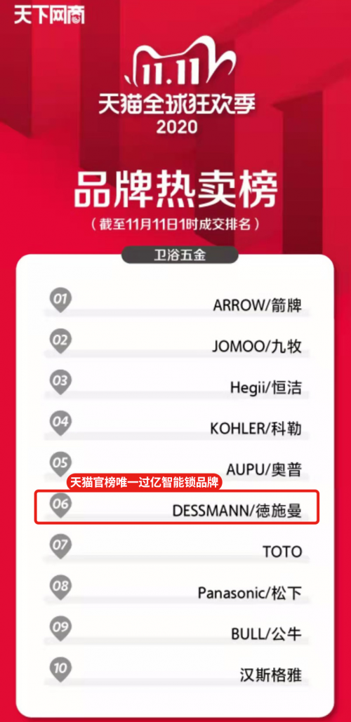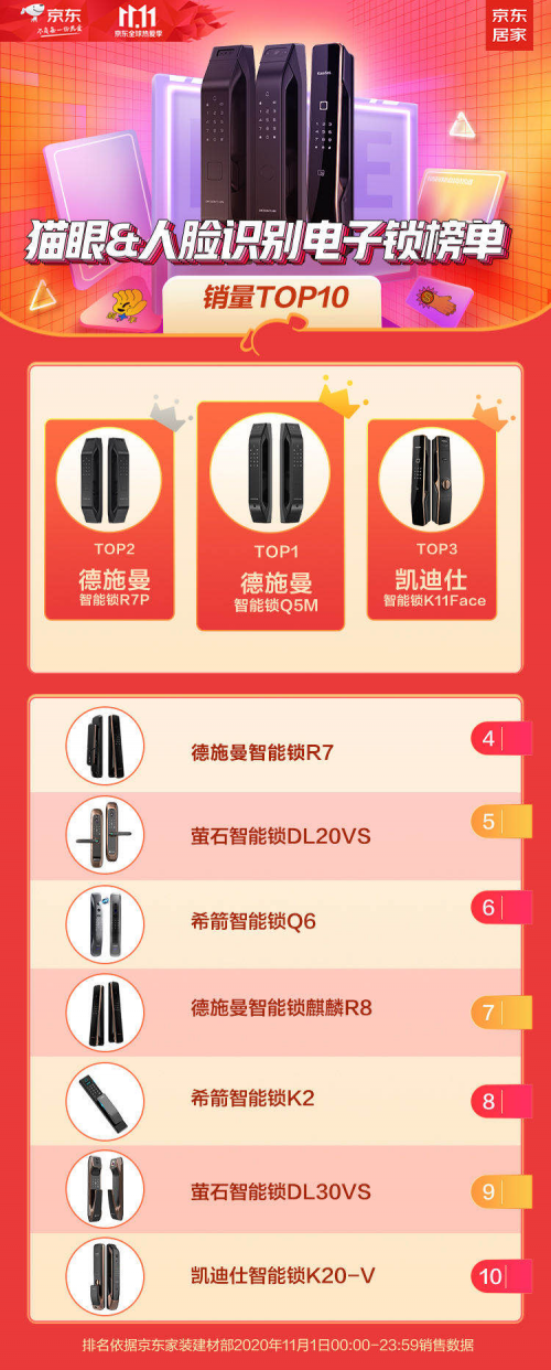 同时,德施曼中高端系列始终霸榜双11各大平台前十位。尤其德施曼全自动系列智能锁总销量突破10万+套,德施曼中高端猫眼&人脸款破4万+套,在各自细分类目里始终处于位置。