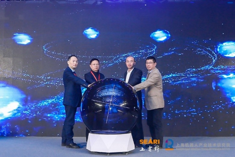 6、上海市经济和信息化委员会智能制造推进处处长韩大东、上海市科学技术委员会基地处副处长陆文斌、上海市普陀区科委主任李文波以及上海机器人产业技术研究院院长郑军奇四位嘉宾共同启动了机器人技术成果发布仪式。