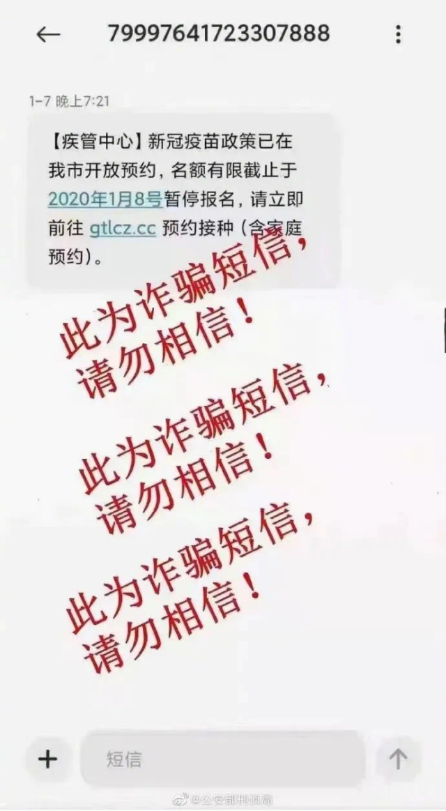 近期,全国多地有序开展新冠病毒疫苗接种工作。冬季疫情防控工作牵动人心,而一些不法分子从中嗅到了“机会”,或蹭疫苗热度,或借防疫设局,冒充各地“疾管中心”,以预约接种新冠疫苗为由,骗取事主个人信息。